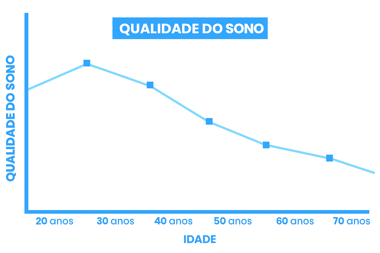 🧠 Resultado: a partir dos 40 anos, a qualidade do sono tende a cair progressivamente, afetando energia, memória e humor no dia seguinte.